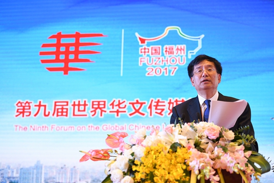 2017年9月10日,第九届世界华文传媒论坛在福州举行。图为中国新闻社社长章新新发表主旨演讲。(图片来源:中新社)