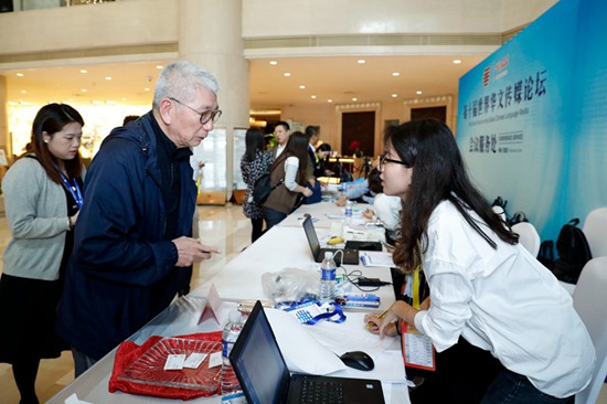 10月11日,河北石家庄,参加论坛的嘉宾代表领取会议材料。第十届世界华文传媒论坛即将于10月12日在石家庄拉开帷幕。(图片来源:中新社)
