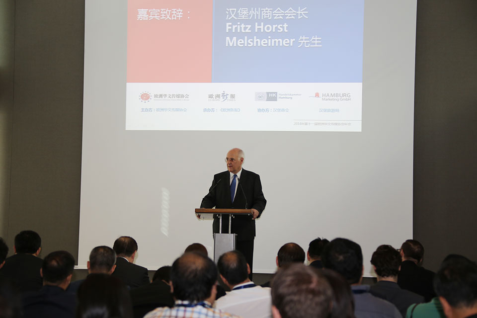 图为汉堡州商会会长Fritz-Horst Melsheimer 在会议上发表讲话。(图片来源:欧洲时报记者黄冠杰 摄)