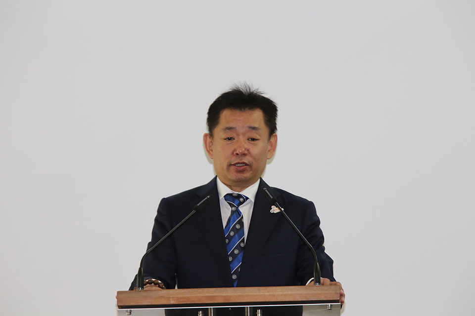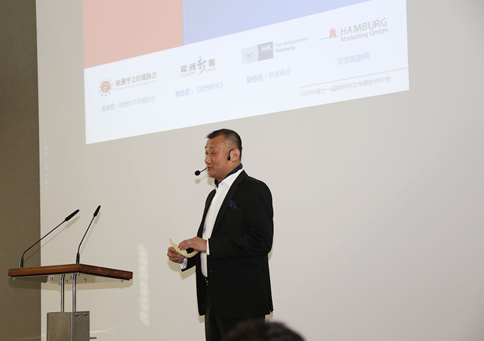 图为承办方代表、《欧洲新报》社长陈茫在会议现场发表讲话。(图片来源:欧洲时报记者黄冠杰 摄)